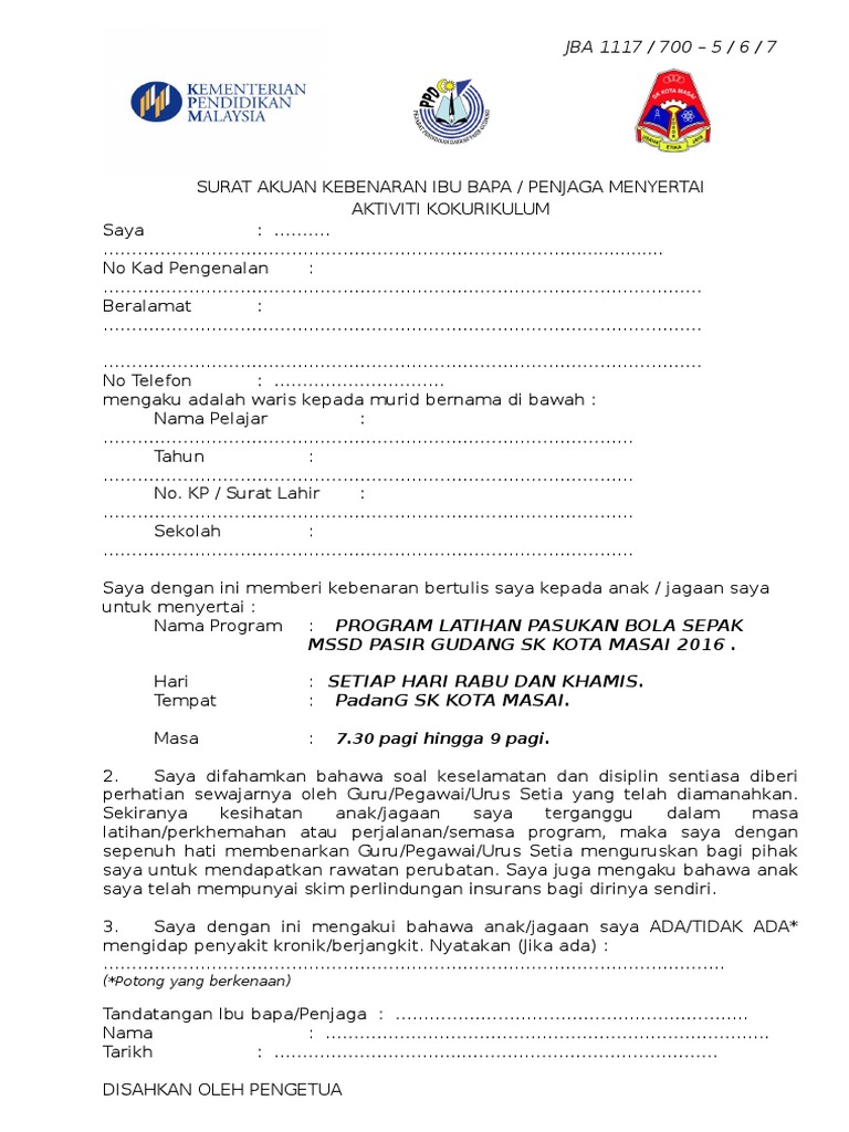 Kalau boleh, surat kemasukan asrama dan sebagainya serta surat daripada guru disediakan (oleh kpm) sebagai surat kebenaran khas kepada ibu bapa yang akan menghantar anak mereka ke sekolah atau asrama di luar daerah atau negeri, katanya pada sidang akhbar perkembangan. Surat kebenaran ibubapa olahraga ppki 2017. Patuhi segala prosedur dan pekeliling sebagai penjawat awam. Surat kebenaran ibu bapa kpm mp3 & mp4. Surat akuan dan kebenaran ibu bapa.